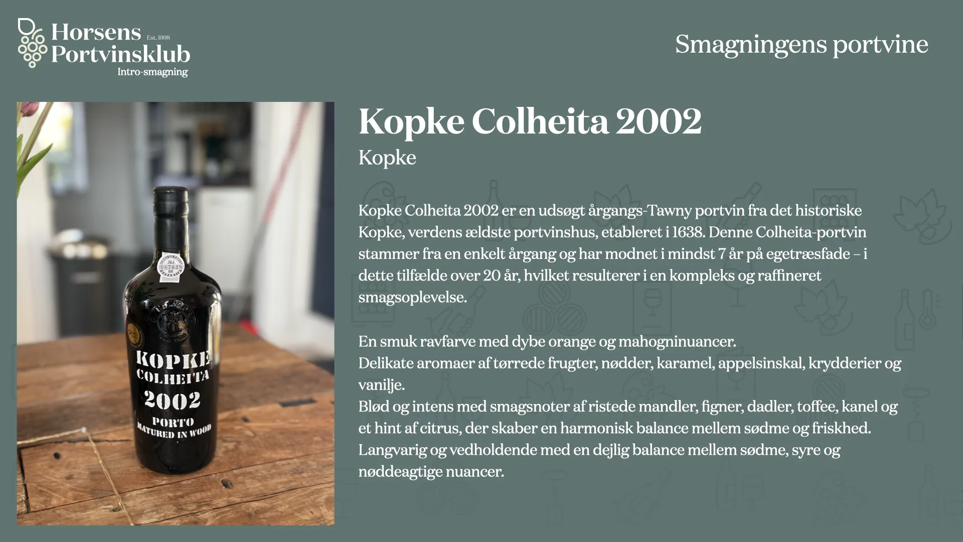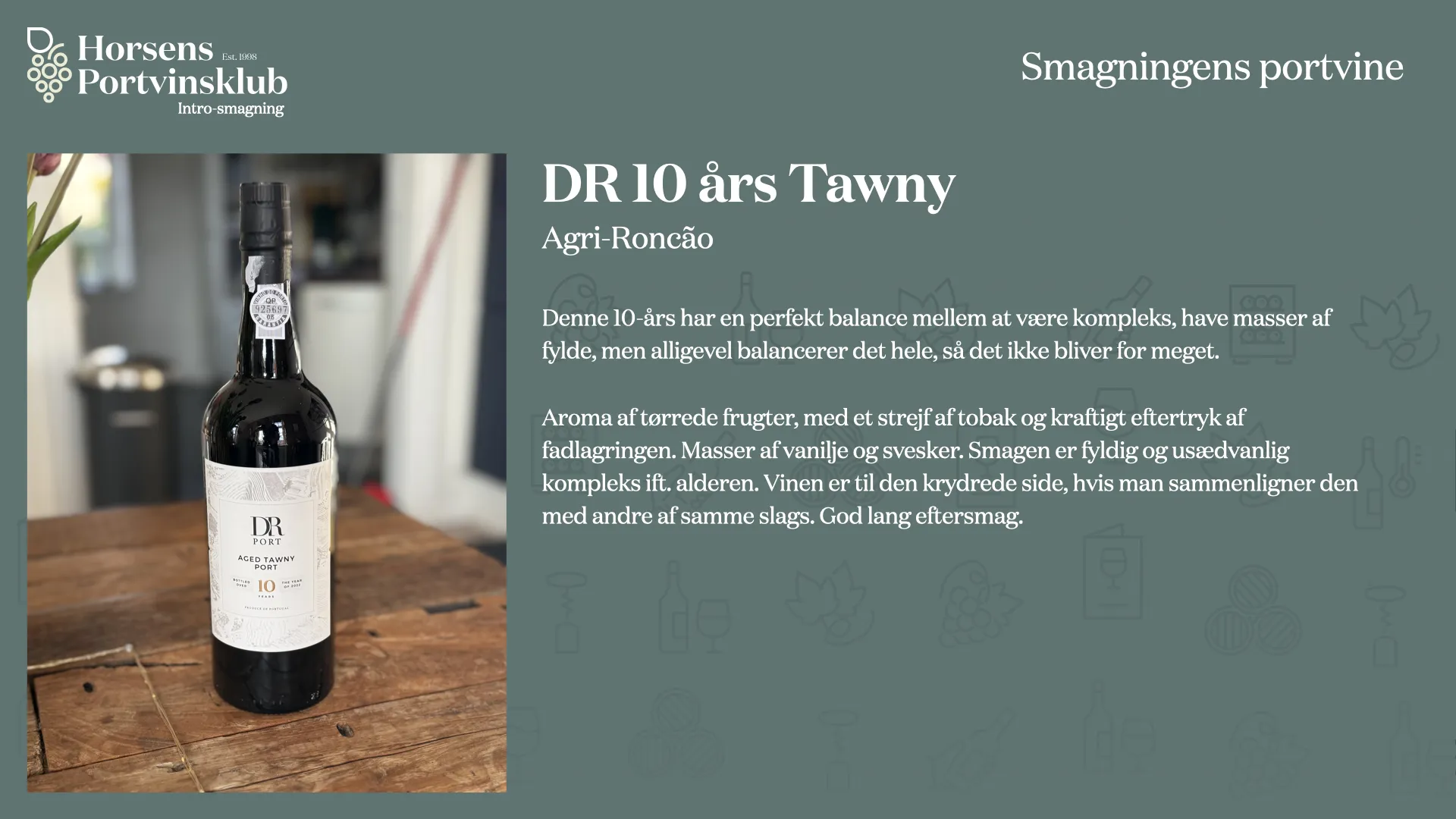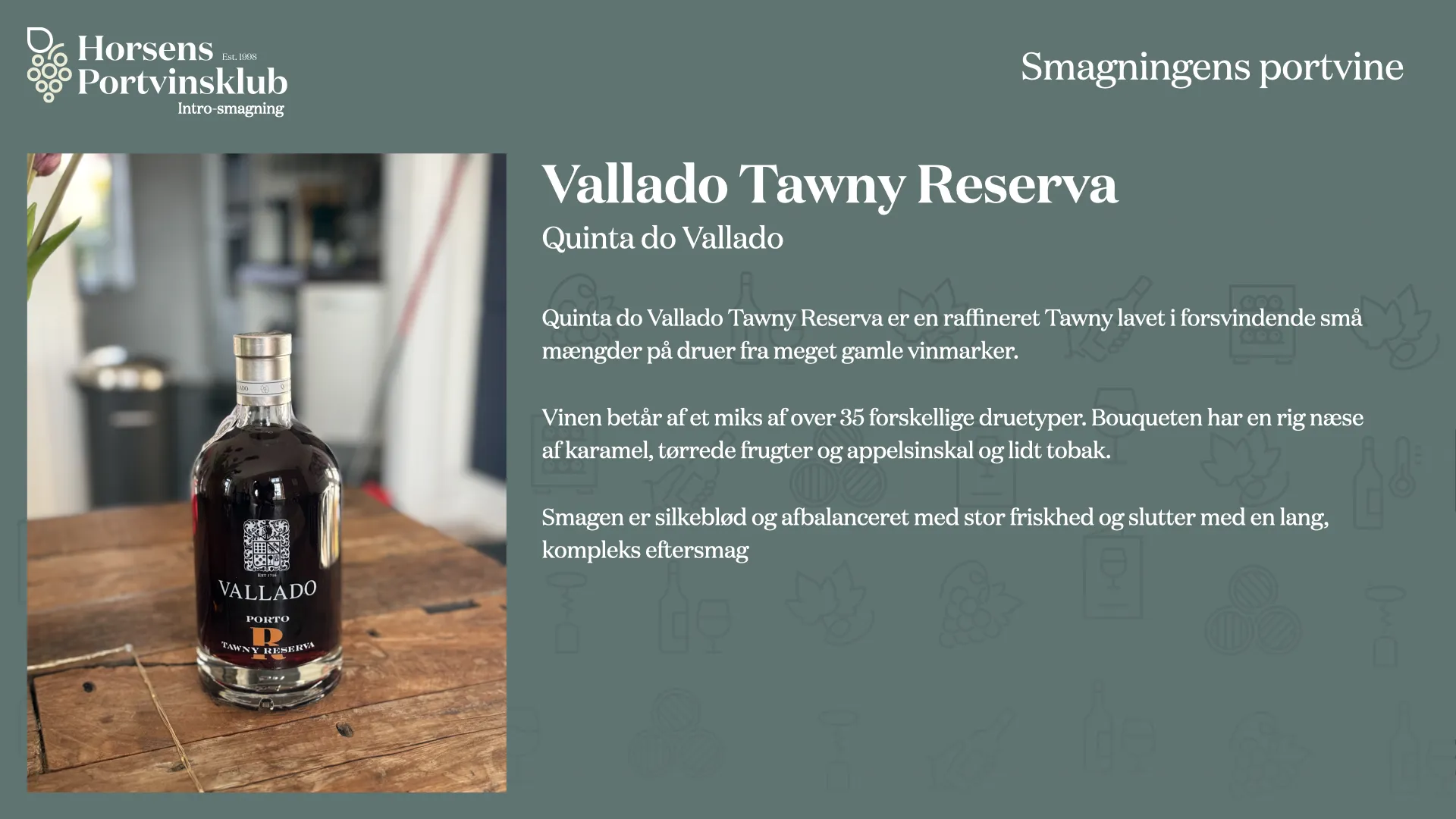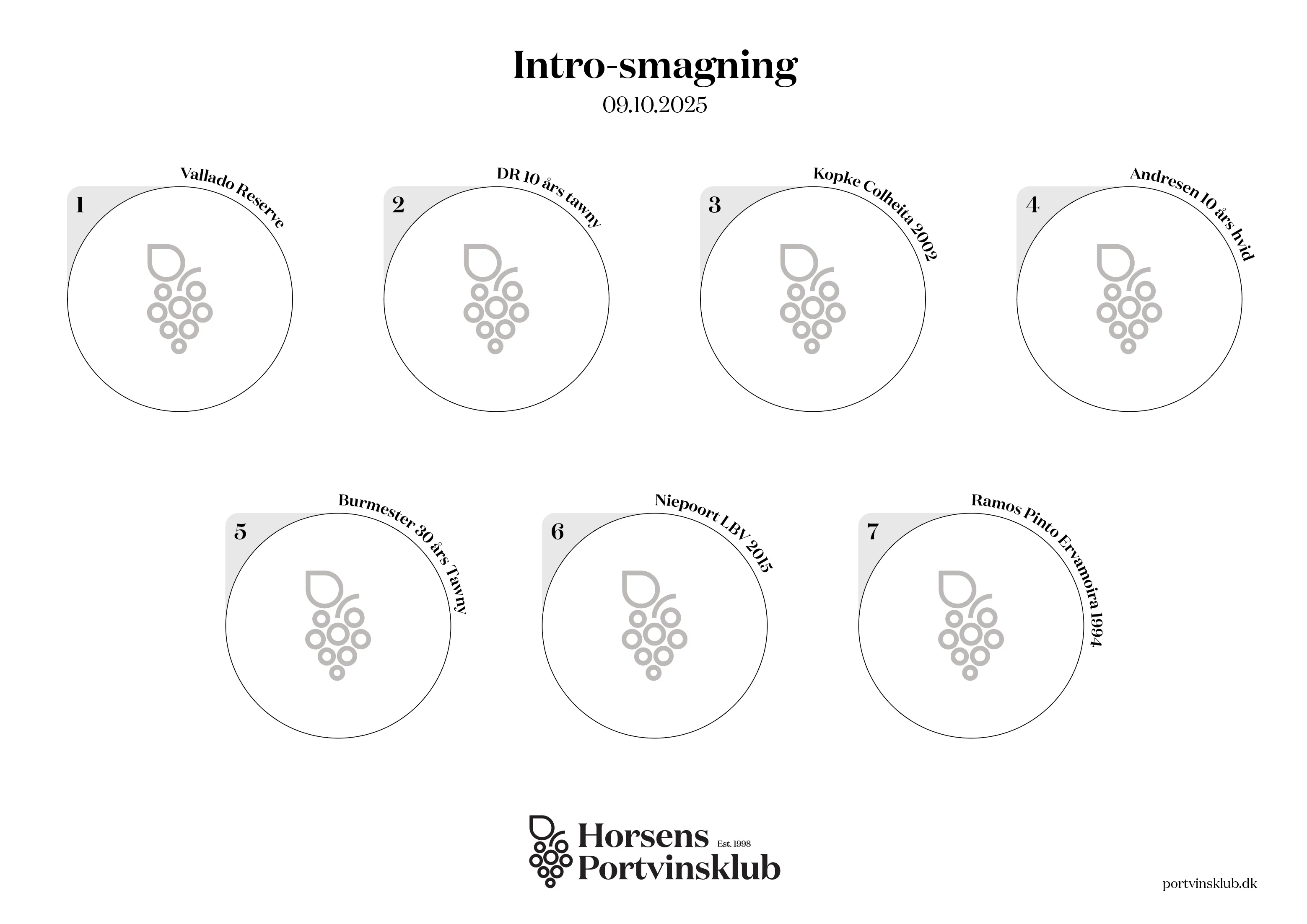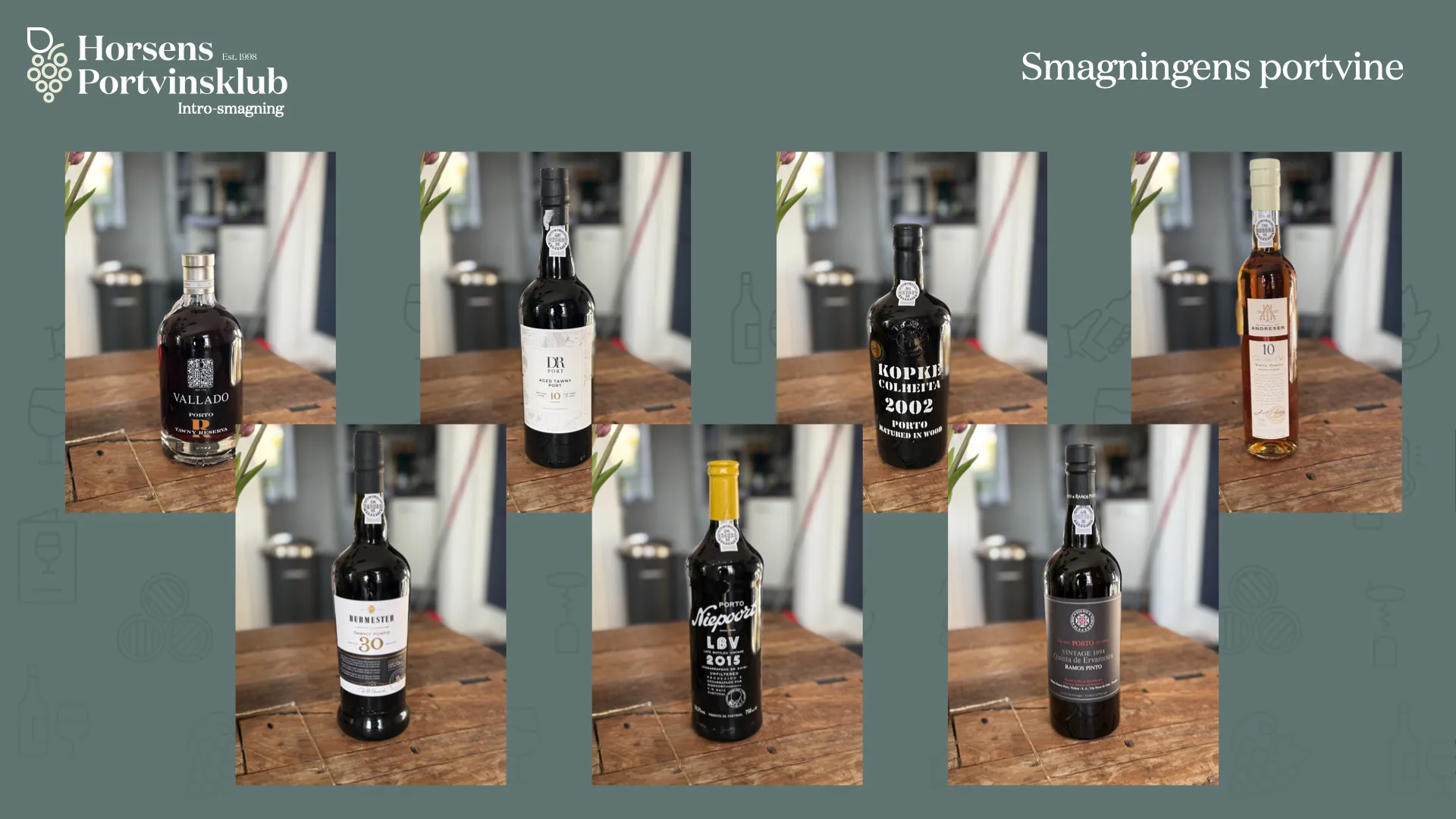 Vi skal til denne smagning smage 7 forskellige portvine, der tager os rundt i de forskellige grene af portvinstyperne. Bestyrelsen vil selv stå for at guide deltagerne gennem dem.
