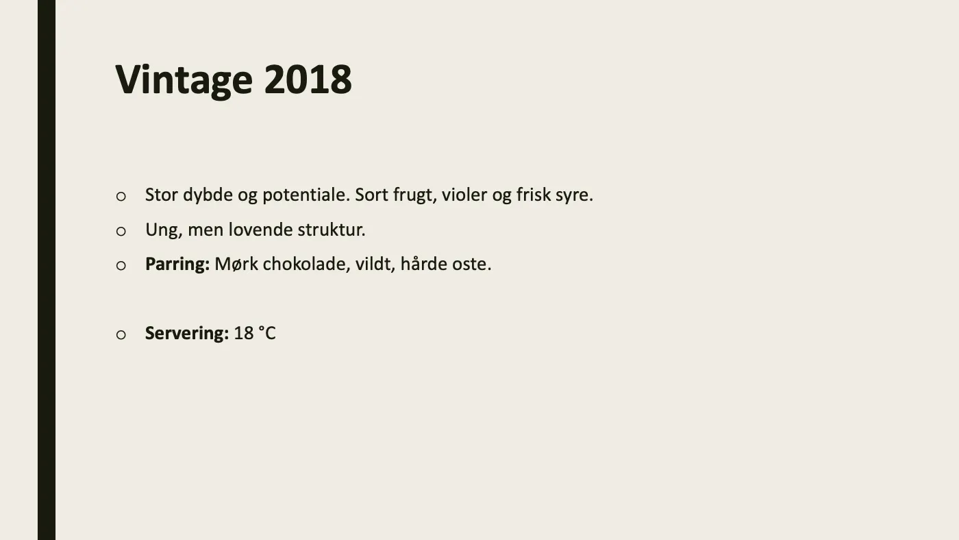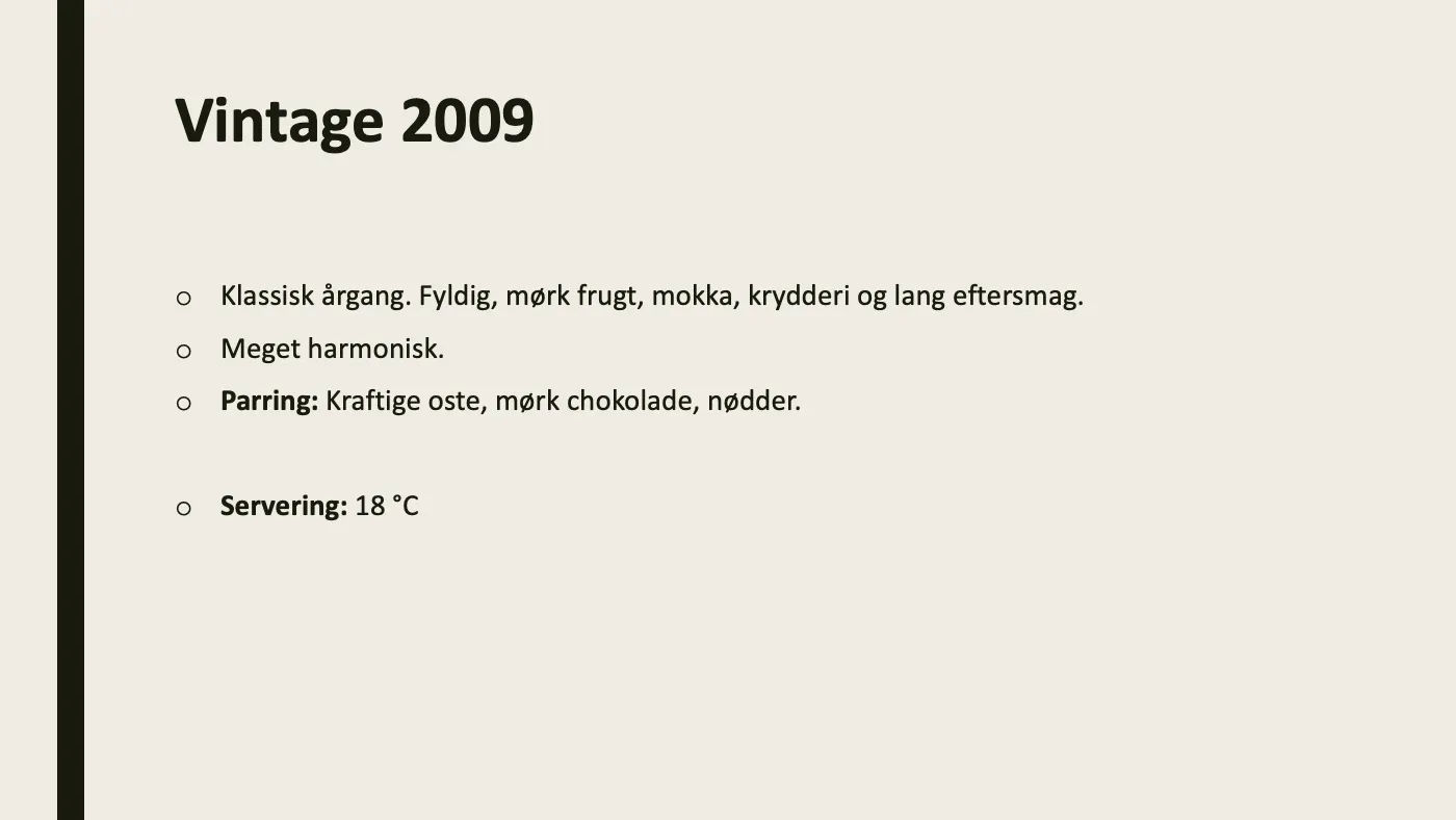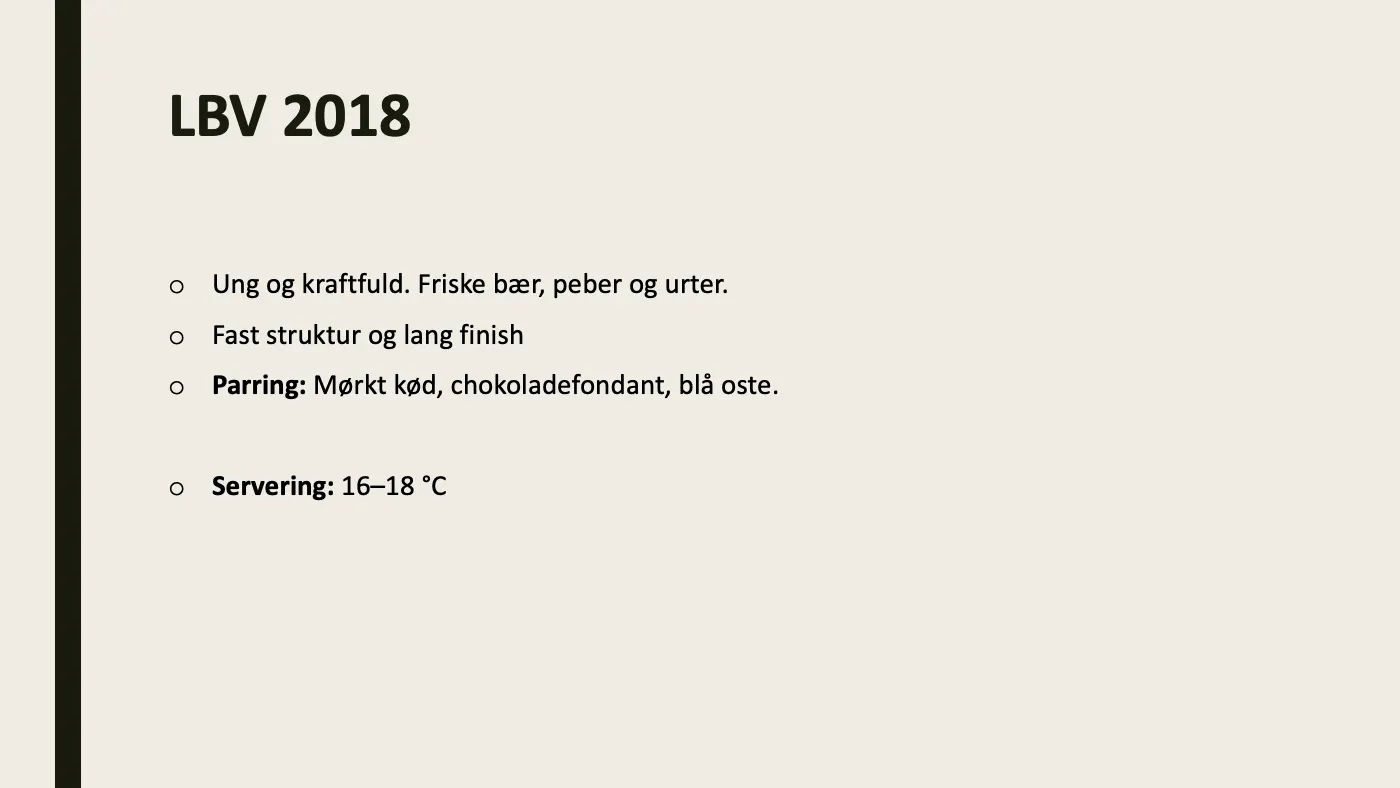 Alle stod flot i glasset med flotte farver. Vintage 2009 var en virkelig fryd at smage med en god syre og potentiale til flere år på hylden endnu. LBV 2018 og Vintage 2018 - ja, fra samme år, hvilket ikke sker ofte - hang rigtig godt sammen smagsmæssigt og den unge vintage skilte sig ud fra andre vintage fra samme årgang. Slet ikke så tung og heftig, men mindede mere om den fra 2009.