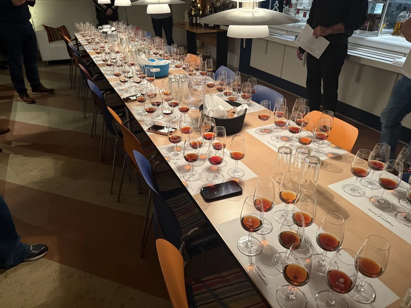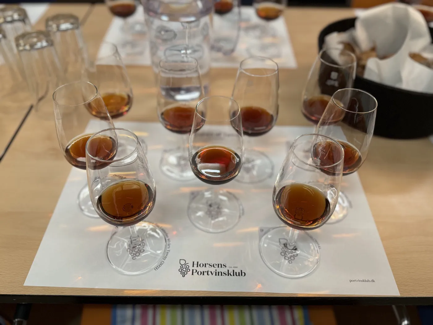 Alle portvine var skænket op i glassene inden deltagerne dukkede op - så kunne de få lidt luft - og man blev mødt af en mur af sødme og skøn duft, når man trådte ind i lokalet.