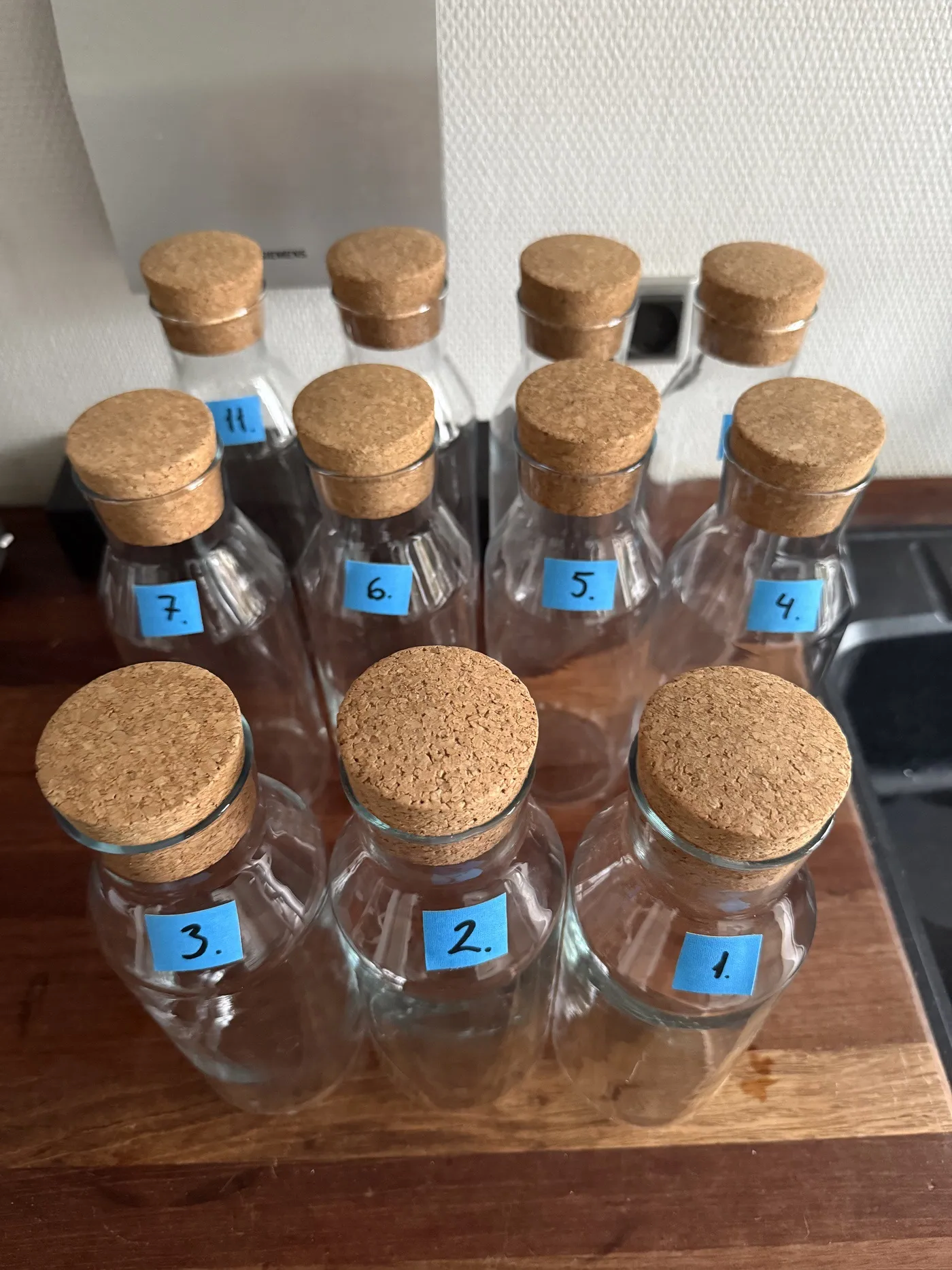 Der var tale om en semiblind smagning, så alle flasker var hældt på karafler for at se om man havde den mindste idé om hvad det var man fik. Et par var ret lette, især den hvide, som var den eneste!